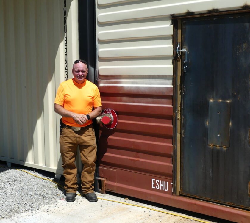 Caption: John Potter, the sole engineer behind the facility’s design and construction, stands outside the structure he built to meet local firefighter training needs.
