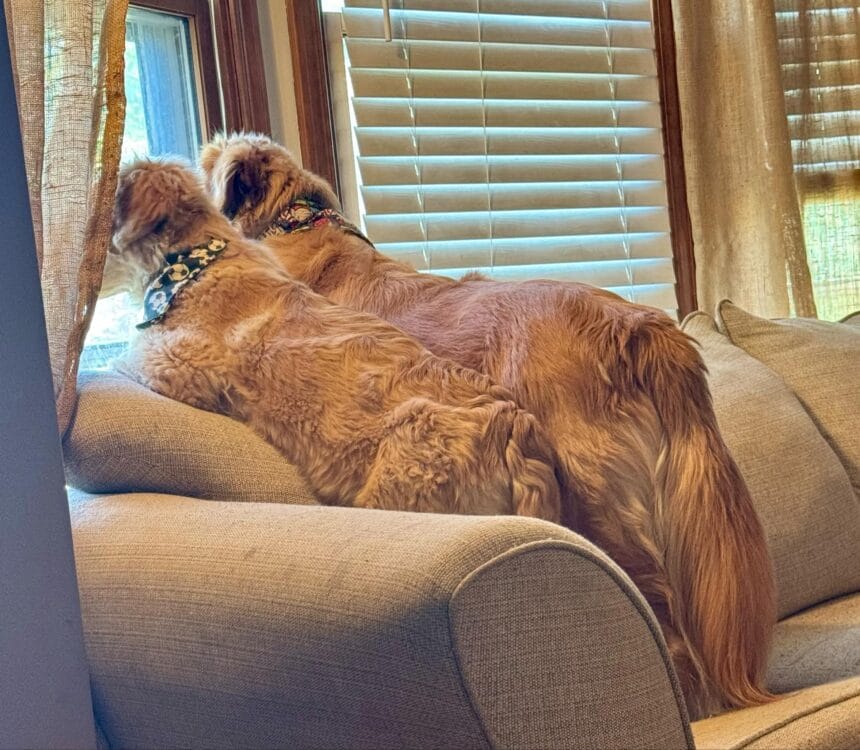 June’s favorite things include Chuck It balls, ice cubes, and unfortunately any chance to get muddy. While Charlie’s favorite things include napping all day, talking back, and being nosy. Charlie will put his entire head into any shopping bag the Peoples bring home. Tonnie shares he also “shoves his entire face into laundry baskets to sniff the clothes inside”.