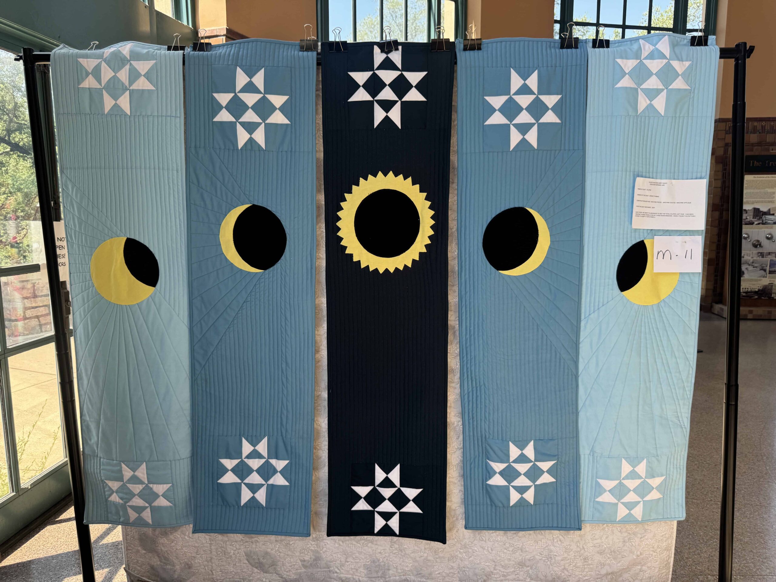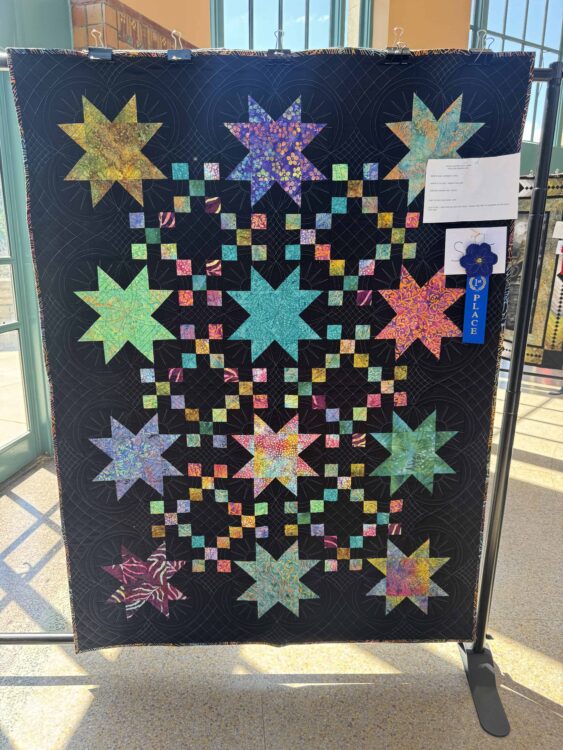 The stunning energy of a midnight sky comes to life in Sherry Wallard’s award-winning quilt, “Midnight Stars,” which took home a 1st Place honor. At first glance, this piece dazzles with its electric palette, bursting stars that pop against a deep black background, creating the illusion of constellations shimmering in a dark sky.