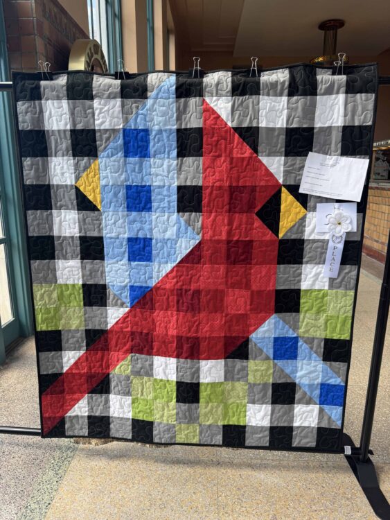 Inspired by her love of birdwatching, Goode’s quilt captures the playful geometry of two iconic species: the bright red cardinal and the vivid blue jay. Set against a bold black-and-white buffalo check background, the quilt juxtaposes the simplicity of block construction with the complexity of color placement, forming a stylized, almost digital image that reads instantly as both art and nature.