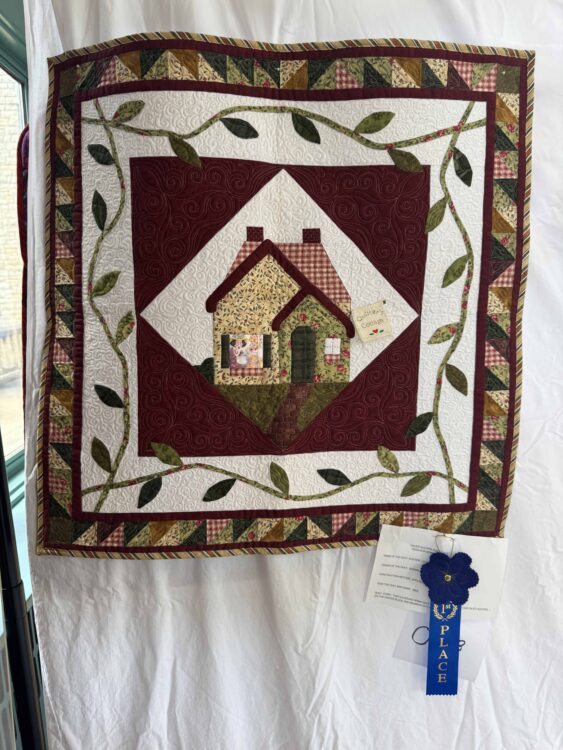 This warm and whimsical wall hanging by Sherry Wallard titled “Quilters Cottage” earned 1st Place honors, not only for its design and execution, but for the collaborative spirit behind it.