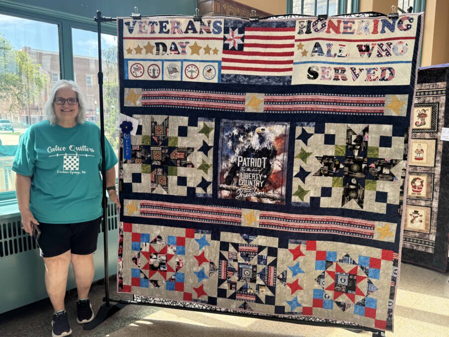 Cathy Harvey shared a quilt that brought meaning and memory to the quilt show. Her Veterans Day quilt, draped in stars, stripes, and heartfelt detail, honors the service of friends and family members across generations.