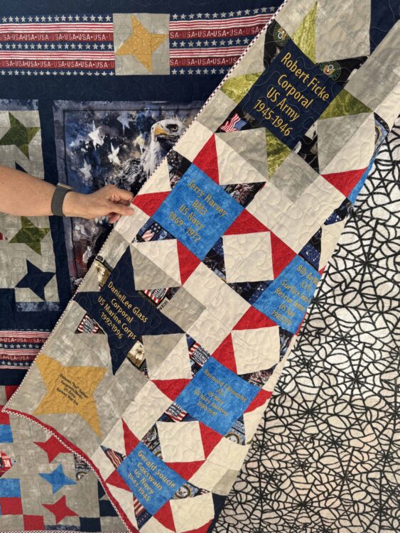 But what makes Harvey’s quilt especially unique is what lies beyond the surface. Each honored service member has their own block, with their names and years of service embroidered on the back of the quilt, a hidden layer of remembrance that makes the quilt not only a visual masterpiece but a deeply personal heirloom.
