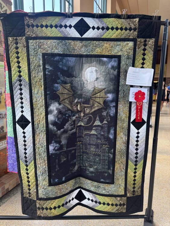 Built around a dramatic central panel featuring a soaring dragon silhouetted against a full moon and a gothic castle, the quilt draws viewers into a fantasy world. The piece was machine pieced and machine quilted in 2024, blending technical skill with creative vision.