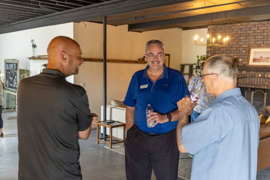 Chamber members Brian RIce and Ben Rubey chat with Keith Hudson at The Overlook's ribbon-cutting.