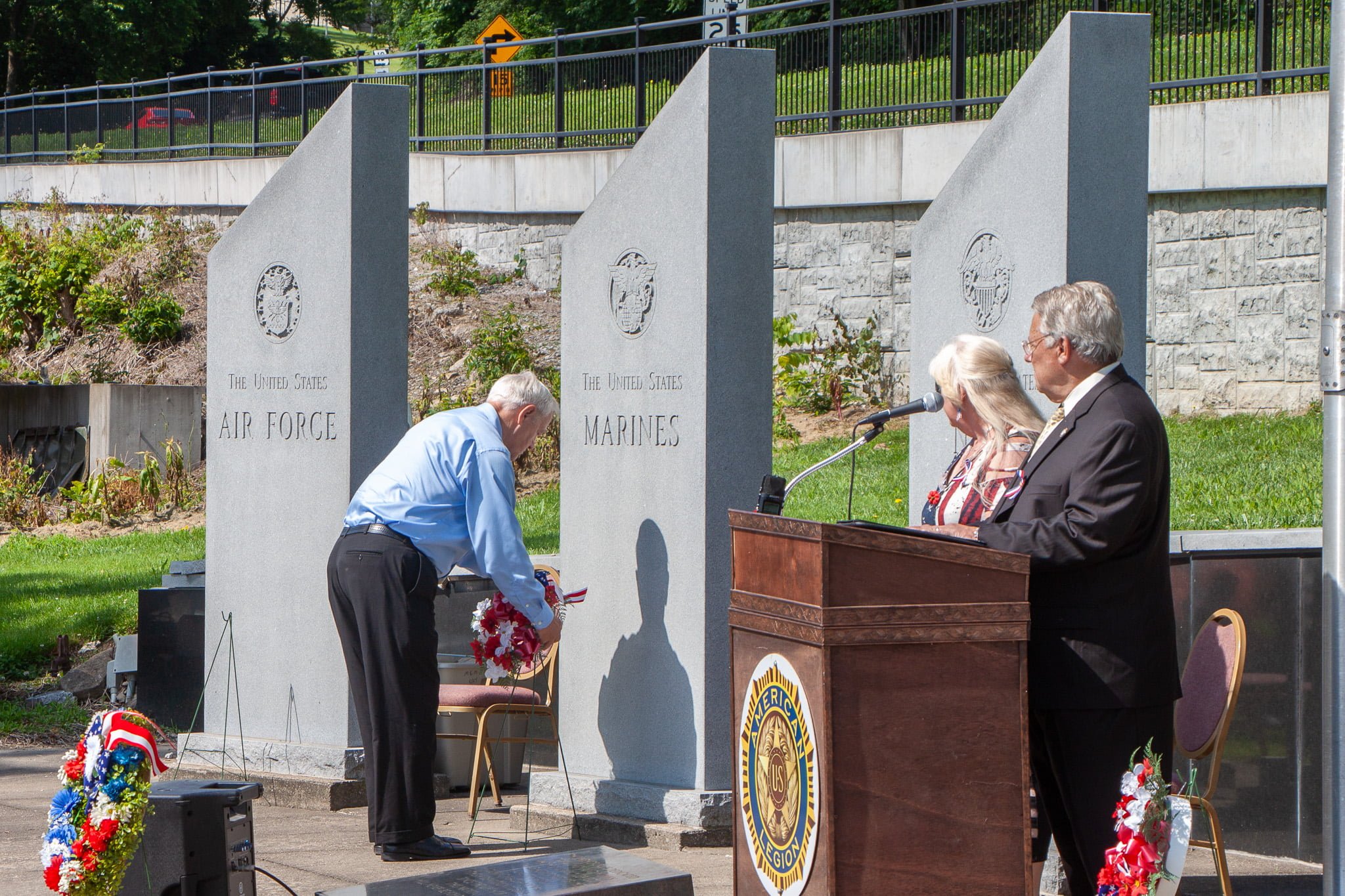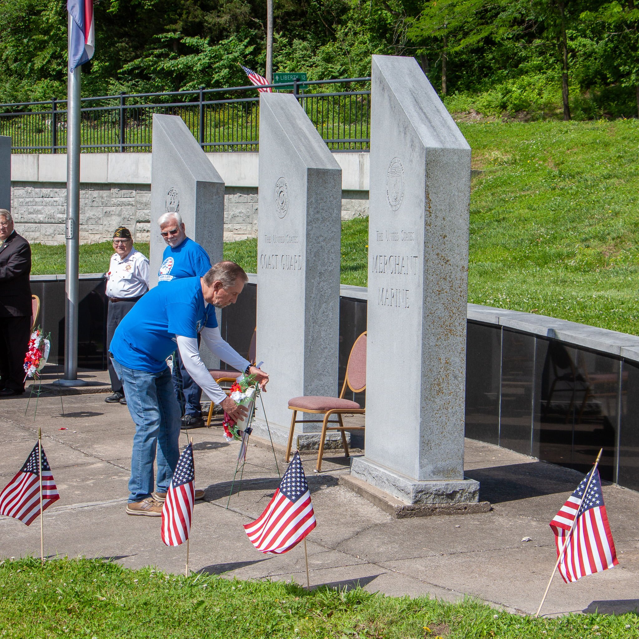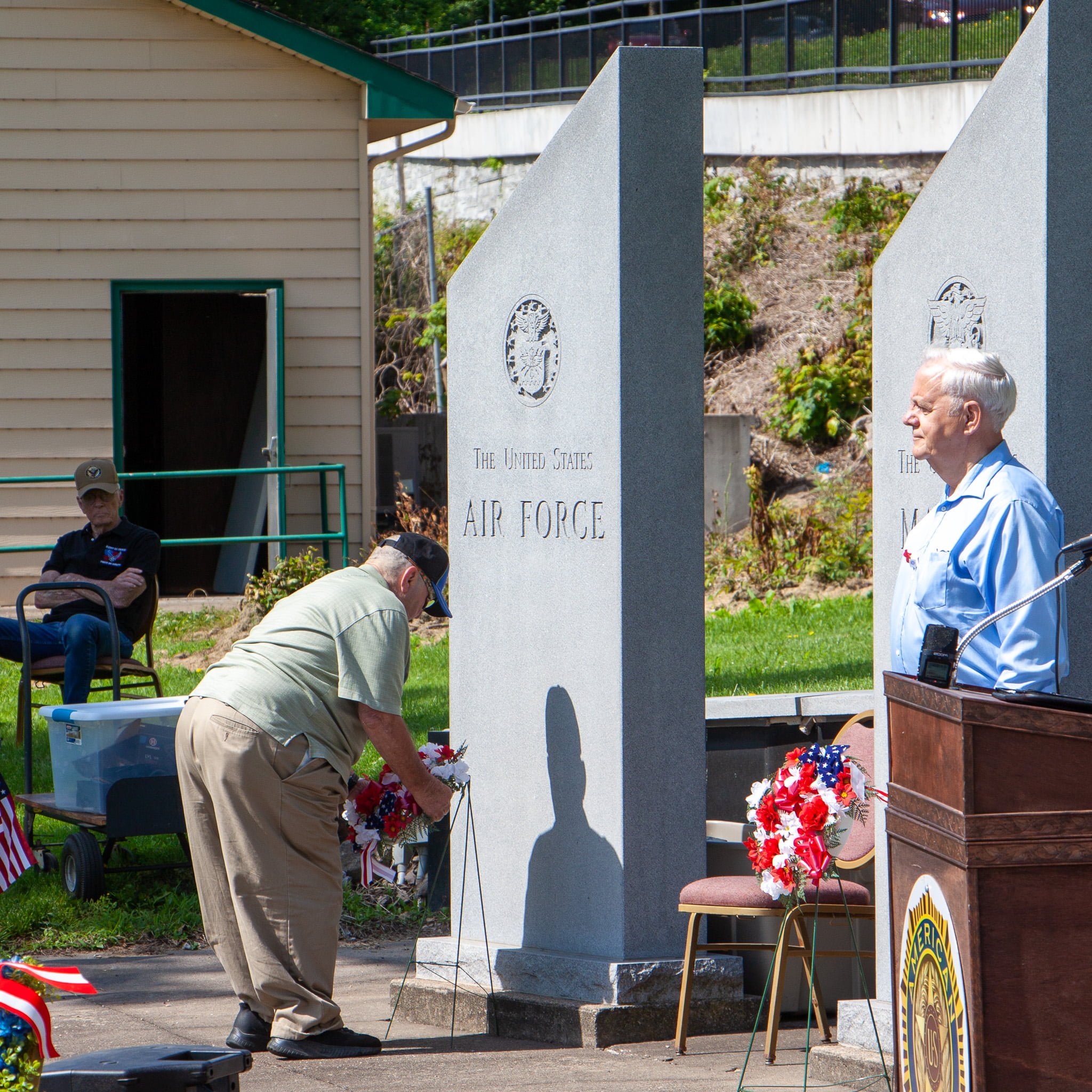 The ceremony continued with the laying of individual wreaths for each branch of the military service. Anna Unterreiner placed the wreath for the Auxiliary, followed by Michael Sutko for the Army, Joyce Scroggins for the Navy, Martin Conrad for the Marines, Joe Arthur for the Air Force, Darryl Couts for the Coast Guard, and Gary Stewart for the Merchant Marines. Each wreath-laying was a poignant tribute to the men and women who have served in these branches.