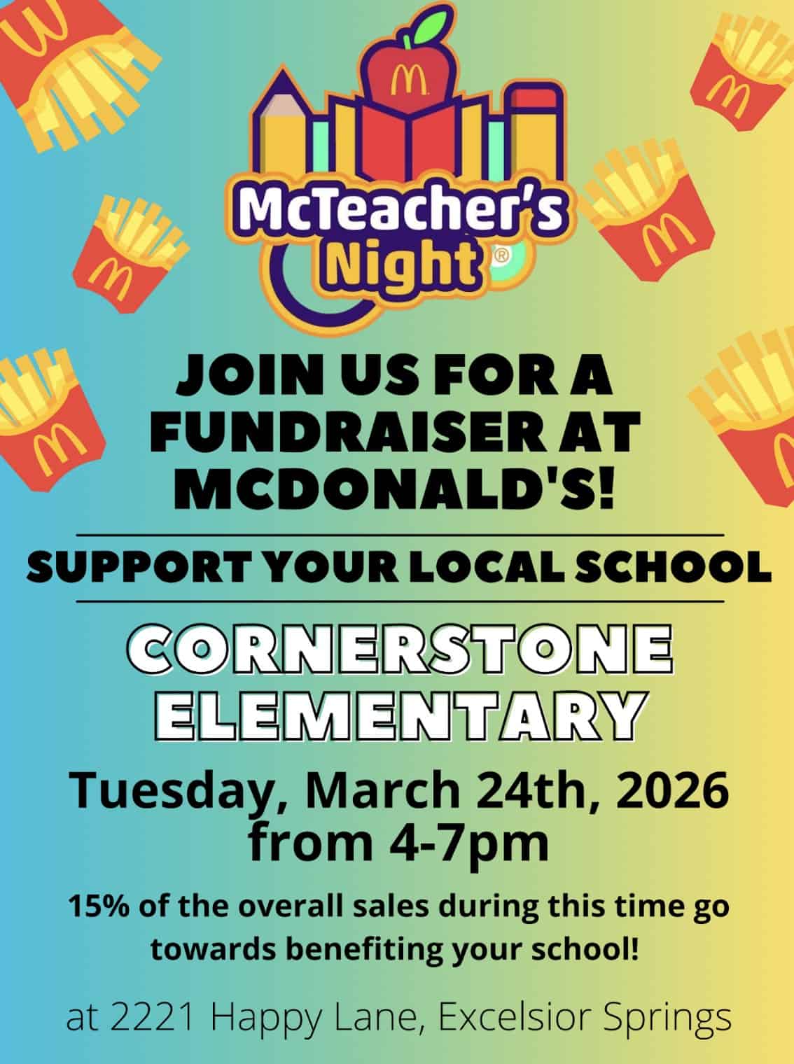 Mar 24 McTeacher’s Night – Cornerstone Elementary 4:00 pm - 7:00 pm McDonald's - Excelsior Springs 2221 Happy Lane, Excelsior Springs Event Details Get Directions