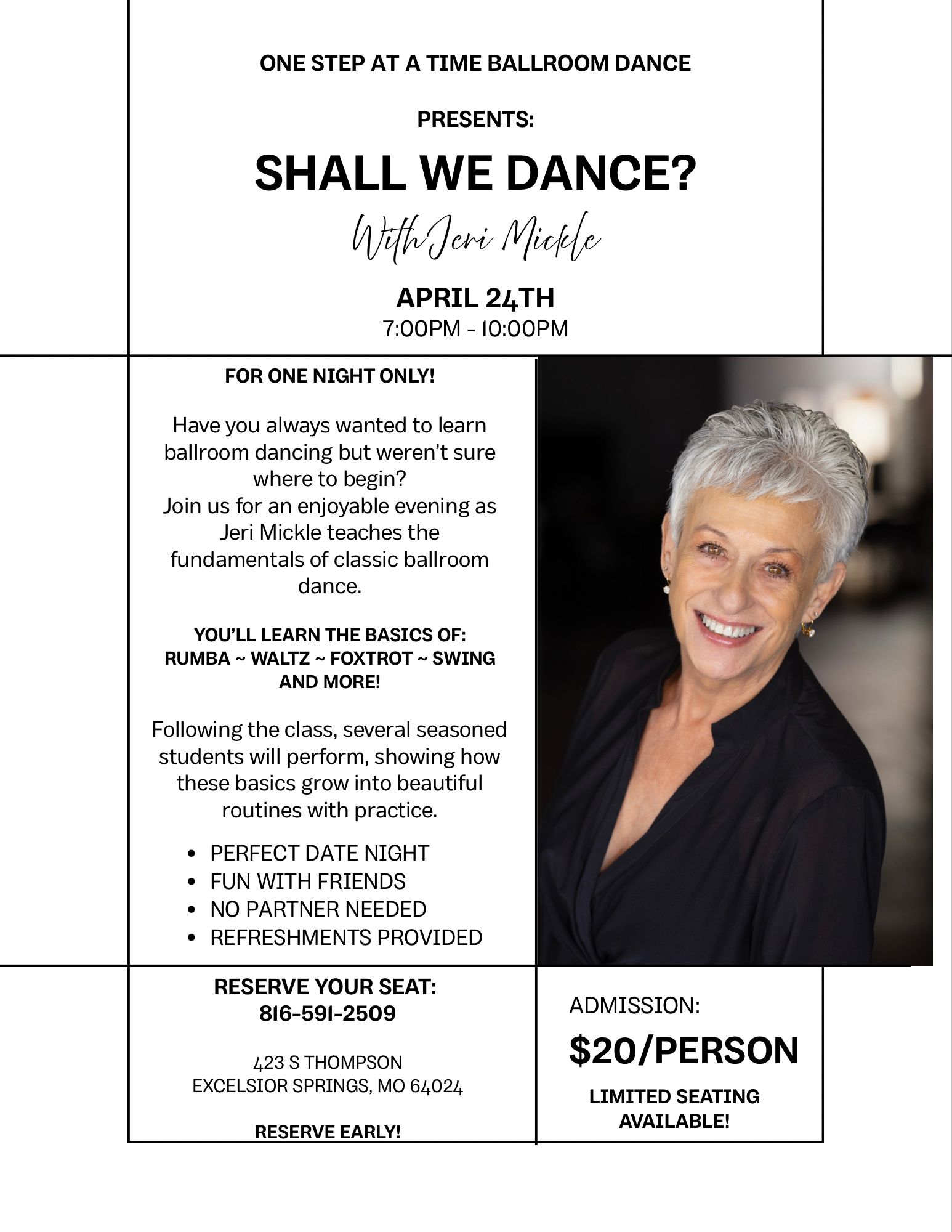 One Step at a Time Ballroom Dance presents Shall We Dance? With Jeri Mickle on April 24th from 7:00pm-10:00pm For one night only! Have you always wanted to learn ballroom dancing but weren't sure where to begin? Join us for an enjoyable evening as Jeri Mickle teaches the fundamentals of classic ballroom dance. You'll learn the...
