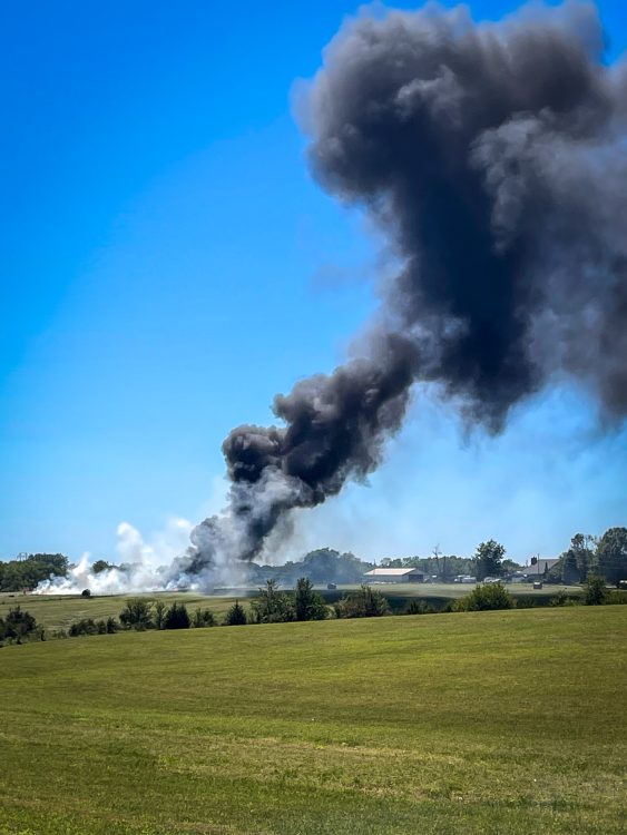 September 1, 2023 – A tractor caught fire while baling hay this afternoon near 12121 Sorrel Dr. Excelsior Springs. Fortunately, the crew operating the machinery made it out safely; however, the equipment was not so lucky. The fire resulted in a total loss of both the tractor and the baler.