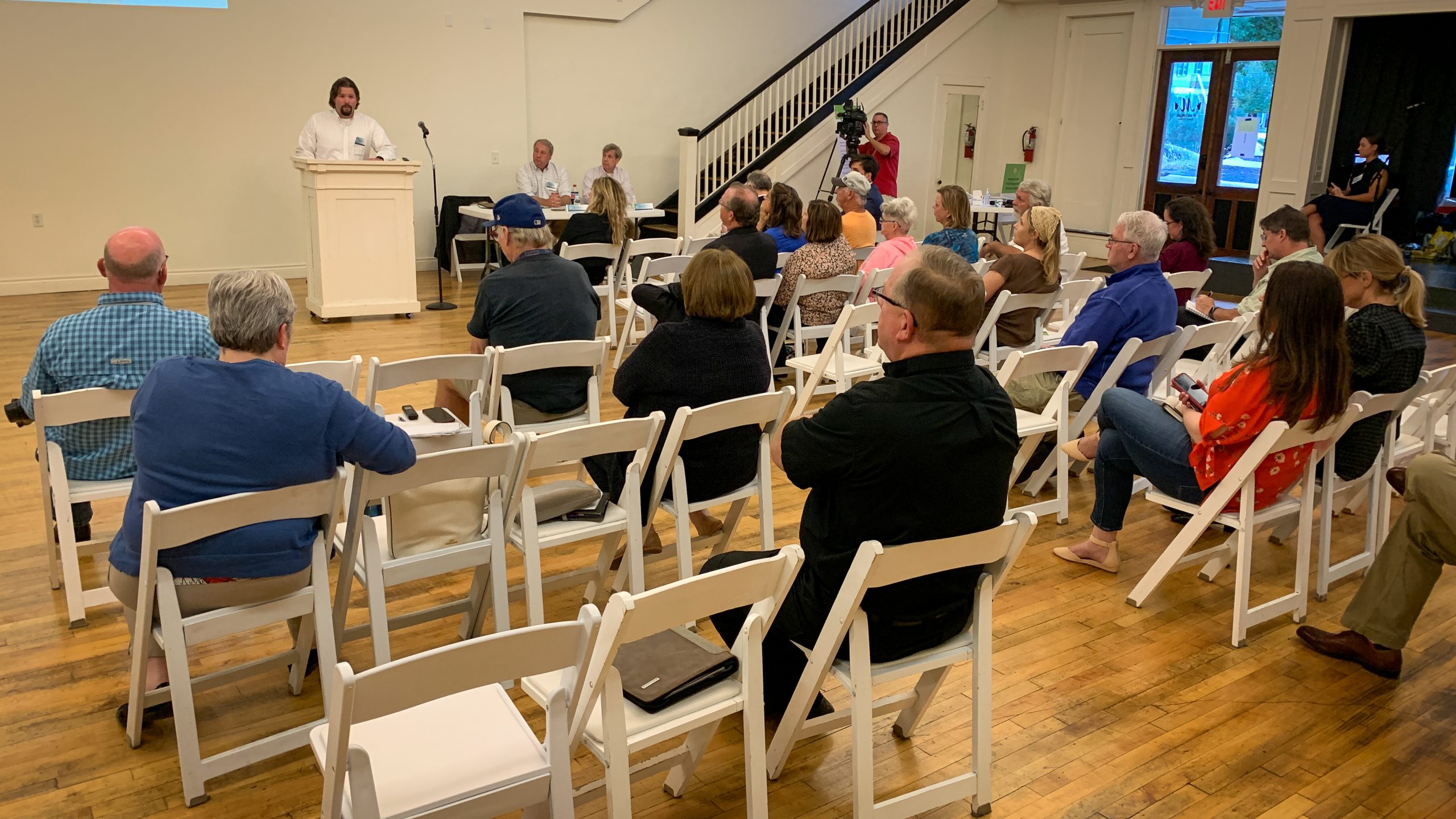 Citizen, City Officials, and News Media gathered at a meeting about the proposed Canadian Pacific/KC Southern Railways Merger (photo S Jason Cole).